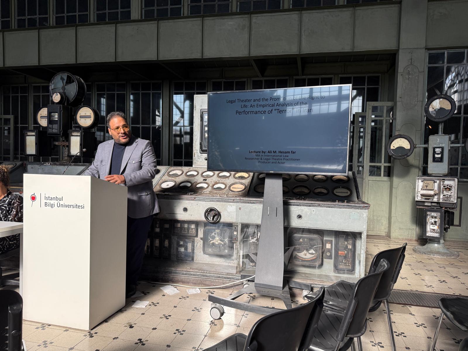 علیمحمد حسامفر تهیهکننده و بازیگر نقش قاضی در این اثر، روز جمعه ۷ آذر در بخش آکادمیک جشنواره که در دانشگاه بیلگی استانبول برگزار میشود، سخنرانی کرد. او در این رویداد که در موزه انرژی دانشگاه برگزار شد، مقالهای را که با مشارکت ابراهیم امینی کارگردان نمایش نگاشته بود، معرفی و درباره نمایش حقوقی و تاثیر تئاتر بر توسعه حقوق بشر مطالبی را ارائه داد.